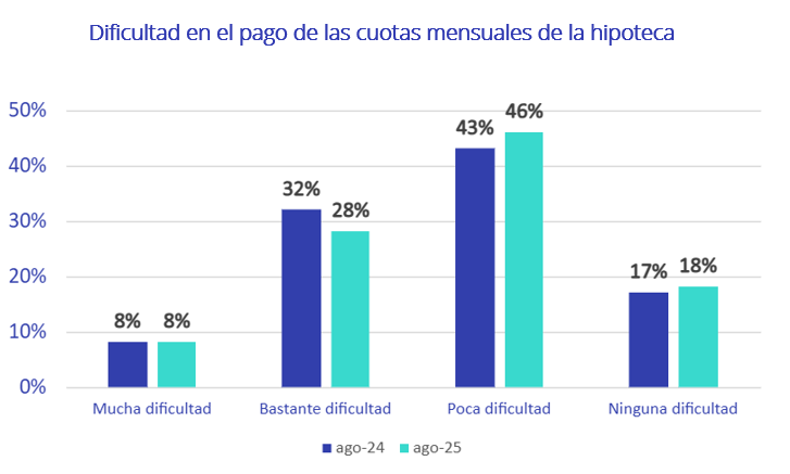 Por su parte, los que resuelven el pago de la hipoteca con poca dificultad constituyen el 46%. Finalmente, un 18% afirman que no sufren ningún problema para efectuar el pago hipotecario. Estos datos dibujan un panorama más cómodo para los hipotecados que el que había hace un año, cuando los que reconocían problemas a la hora de superar su obligación mensual ascendían hasta el 40%, de los cuales el 32% declaraba hacerlo con ‘bastante’ dificultad.