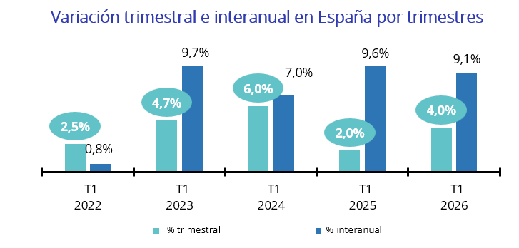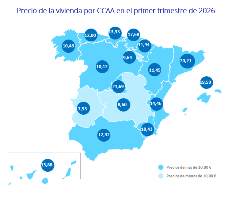 En las Comunidades Autónomas este primer trimestre de 2026 se presenta con 14 incrementos trimestrales y 16 incrementos interanuales. El orden de los incrementos trimestrales es: Cantabria (11,1%), Aragón (6,9%), Madrid (6,7%), Comunitat Valenciana (5,9%), Andalucía (5,6%), Castilla y León (5,2%), Galicia (5,0%), Región de Murcia (4,8%), Baleares (4,3%), Canarias (4,3%), Asturias (2,7%), Extremadura (2,2%), Cataluña (0,9%) y País Vasco (0,1%). Por otro lado, los descensos trimestrales se produjeron en las comunidades de La Rioja (-3,0%), Navarra (-1,3%) y Castilla-La Mancha (-1,1%).