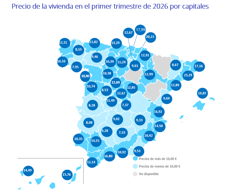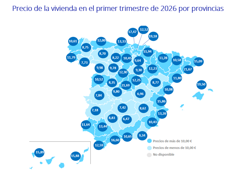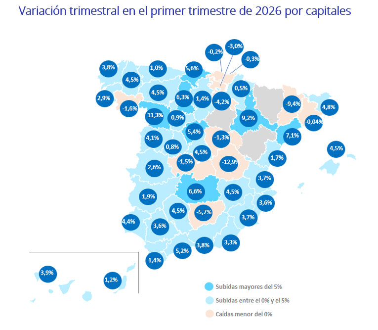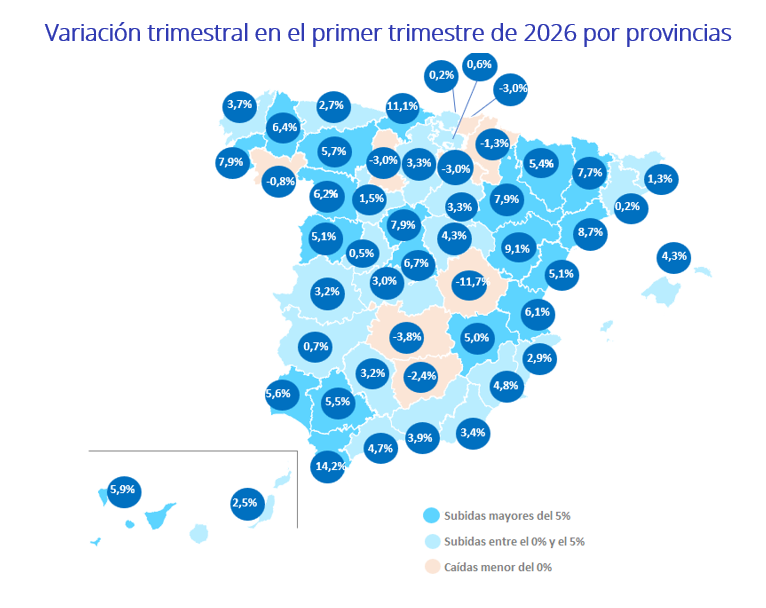 En las provincias, este primer trimestre de 2026 se presenta con 42 subidas trimestrales y 47 interanuales. Las cinco provincias con los mayores incrementos trimestrales son: Cádiz (14,2%), Cantabria (11,1%), Teruel (9,1%), Tarragona (8,7%) y Zaragoza (7,9%). Por otro lado, ocho provincias presentan descensos trimestrales y son Cuenca (-11,7%), Ciudad Real (-3,8%), Gipuzkoa (-3,0%), La Rioja (-3,0%), Palencia (-3,0%), Jaén (-2,4%), Navarra (-1,3%) y Ourense (-0,8%).