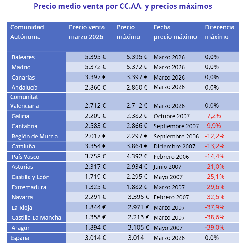 Así, en marzo de 2026 se alcanzan precios máximos en Andalucia, Aragón, Asturias, Baleares, Canarias, Castilla y León, la Comunitat Valenciana, Extremadura, Galicia, Madrid, País Vasco y Murcia.