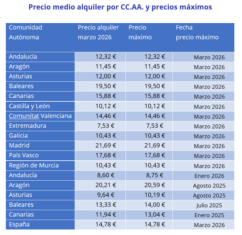 - El alquiler no da tregua y marca récord histórico en 14,46 €/m² y con 12 comunidades autónomas que marcan precios máximos en marzo