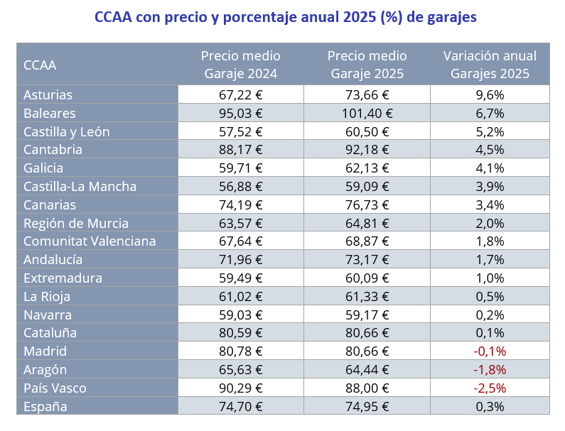 En cuanto a los precios en 2025, las CCAA con el precio medio de los garajes en alquiler por encima de los 80 euros son: Baleares 101,40 euros al mes, Cantabria con 92,18 euros al mes, País Vasco con 88,00 euros al mes, Madrid con 80,66 euros al mes y Cataluña con 80,66 euros al mes. Por otro lado, las CCAA en donde el precio medio de los garajes son los más económicos son Castilla-La Mancha con 59,09 euros al mes, Navarra con 59,17 euros al mes, Extremadura con 60,09 euros al mes y Castilla y León con 60,50 euros al mes.