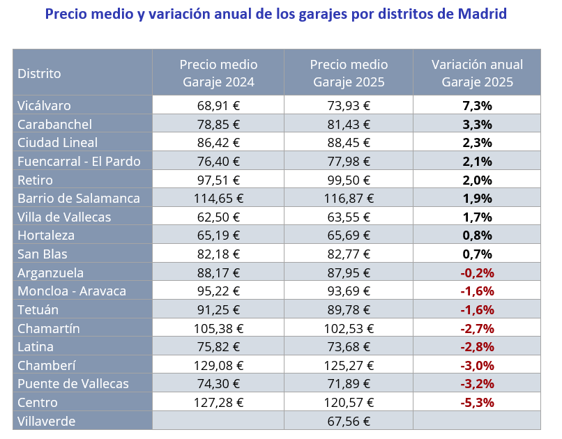 En nueve de los 17 distritos analizados de Madrid el precio de los garajes en alquiler ha subido en 2025. El distrito con mayor subida de precios anual es Vicálvaro (7,3%), Carabanchel (3,3%), Ciudad Lineal (2,3%), Fuencarral – El Pardo (2,1%), Retiro (2,0%), Barrio de Salamanca (1,9%), Villa de Vallecas (1,7%), Hortaleza (0,8%) y San Blas (0,7%). Por otro lado, los distritos en donde se producen descensos en los precios son: Centro (-5,3%), Puente de Vallecas (-3,2%), Chamberí (-3,0%), Latina (-2,8%), Chamartín (-2,7%), Tetuán (-1,6%), Moncloa – Aravaca (-1,6%) y Arganzuela (-0,2%).