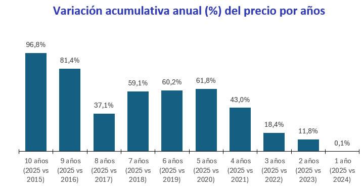 El precio de una habitación en España cuesta de media 521 euros al mes, es decir, un 62% más que hace 5 años (desde 2020) y un 97% más respecto a hace 10 años (2015), según el estudio a mitad año de “Viviendas compartidas en España en 2025” basado en los precios de la vivienda en alquiler del mes de diciembre de los últimos 10 años del Índice Inmobiliario Fotocasa.