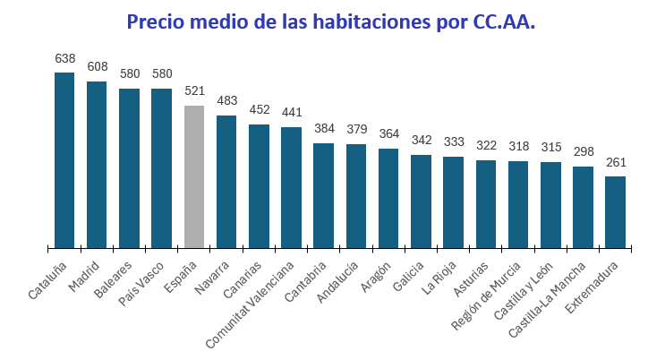 El orden de las comunidades autónomas que se han visto afectadas por el incremento del alquiler de las habitaciones en 2025 es: Castilla-La Mancha (12,5%), Cantabria (8,2%), Extremadura (8,0%), Castilla y León (4,9%), Galicia (4,0%), Madrid (3,7%), Comunitat Valenciana (3,1%), Región de Murcia (3,1%), Canarias (2,9%), Navarra (2,5%), Asturias (2,3%), La Rioja (2,0%), Aragón (1,9%), País Vasco (1,2%), Baleares (1,0%) y Cataluña (0,4%). Por otro lado, la comunidad en el que el precio anual desciende es Andalucía (-3%).