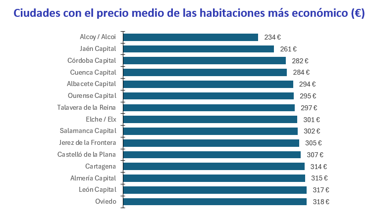 Por otro lado, la ciudad más económica para alquilar una habitación es Alcoy / Alcoi con 234 euros/mes. Le siguen, Jaén capital con 261 euros/mes, Córdoba capital con 282 euros/mes, Cuenca capital con 284 euros/mes, Albacete capital con 294 euros/mes, Ourense capital con 295 euros/mes y Talavera de la Reina con 297 euros/mes.