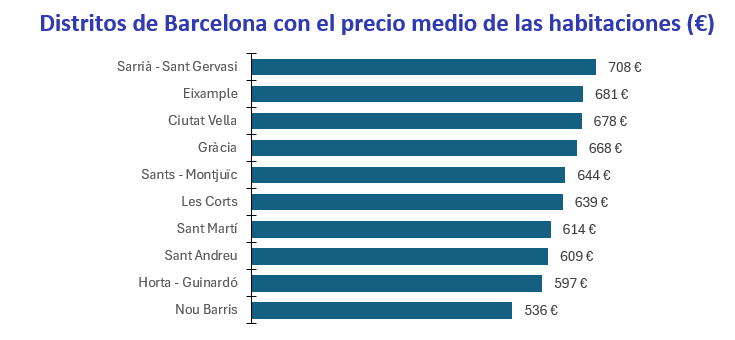 El estudio de Fotocasa analiza también el precio de distritos barceloneses. Solo un distrito tiene el precio por encima de los 700 euros al mes es Sarrià – Sant Gervasi con 708 euros al mes. Le siguen, con un precio superior a los 600 euros los distritos de Eixample con 681 euros al mes, Ciutat Vella con 678 euros al mes, Gràcia con 668 euros al mes, Sants – Montjuïc con 644 euros al mes, Les Corts con 639 euros al mes, Sant Martí con 614 euros al mes y Sant Andreu con 609 euros al mes.