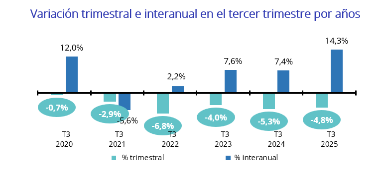 En las ciudades, este tercer trimestre de 2025 se presenta con el 56% caídas trimestrales y el 85% con subidas interanuales. Las seis ciudades analizadas por Fotocasa con los mayores descensos trimestrales son: El Ejido (-31,7%), Águilas (-23,7%), Ribeira (-21,6%), Canet d’En Berenguer (-21,2%), Castro-Urdiales (-21,1%) y Garrucha (-20,8%). Por otro lado, las ciudades con los mayores incrementos trimestrales de la vivienda son: Castelldefels (16,0%), Puerto Real (13,6%), Parla (13,3%), Leganés (13,1%), Sant Joan d’Alacant (12,1%), Zafra (11,2%), Ponferrada (10,6%) y Vila-real (10,4%) y Moncada (10,3%).