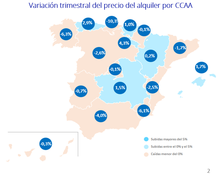 En cuanto a las CCAA, este tercer trimestre de 2025 se presenta con 11 caídas trimestrales (frente a las 14 del 3T-2024) y 17 subidas interanuales. Las comunidades con incrementos trimestrales son: Cantabria (-10,3%), Galicia (-6,3%), Región de Murcia (-6,1%), Andalucía (-4,0%), Castilla y León (-2,6%), Comunitat Valenciana (-2,5%), Cataluña (-1,7%), Extremadura (-0,7%), Canarias (-0,3%), Madrid (-0,1%) y Navarra (-0,1%). Por el contrario, las seis regiones en las que se produce incrementos trimestrales en el precio del alquiler son: La Rioja (4,3%), Asturias (2,9%), Baleares (1,7%), Castilla-La Mancha (1,5%), País Vasco (1,0%) y Aragón (0,2%).