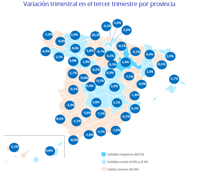 En las provincias, este tercer trimestre de 2025 se presenta con 30 caídas trimestrales y 50 subidas interanuales. Las diez provincias que más han descendido en el precio de la vivienda trimestral en este periodo son: Cantabria (-10,3%), Ávila (-9,0%), Lugo (-9,0%), Huelva (-8,6%), Cádiz (-8,0%), Almería (-7,6%), Teruel (-7,5%), Jaén (-7,5%), A Coruña (-7,0%) y Pontevedra (-6,9%). Por otro lado, las 10 provincias con incrementos trimestrales son: Zaragoza (5,4%), León (4,6%), Zamora (4,6%), La Rioja (4,3%), Cuenca (3,9%), Ciudad Real (3,8%), Girona (2,9%), Asturias (2,9%), Araba – Álava (2,6%) y Ourense (2,5%).