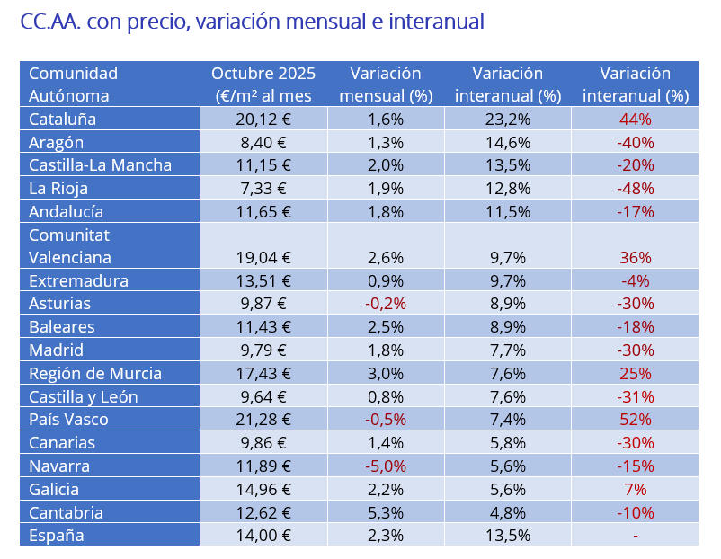 Si analizamos los precios del alquiler respecto a los de hace un año, se observa que en las 17 comunidades se incrementa el precio interanual en octubre. Las comunidades autónomas con incrementos superiores al 10% son: Cataluña (23,2%), Castilla-La Mancha (14,6%), Aragón (13,5%), Extremadura (12,8%) y Asturias (11,5%). Le siguen, Baleares (9,7%), Comunitat Valenciana (9,7%), La Rioja (8,9%), Andalucía (8,9%), Región de Murcia (7,7%), País Vasco (7,6%), Castilla y León (7,6%), Madrid (7,4%), Galicia (5,8%), Cantabria (5,6%), Canarias (5,6%) y Navarra (4,8%).