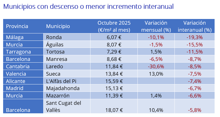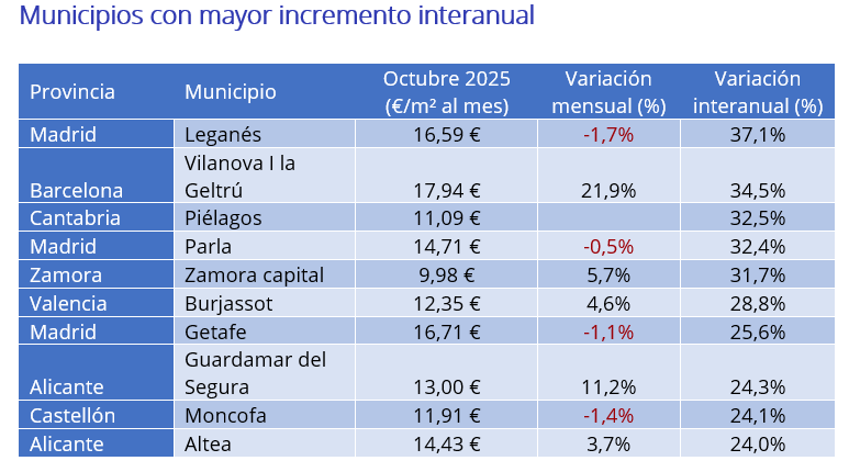 En el 83% de los 199 municipios analizados con variación interanual el precio de las viviendas en alquiler se ha incrementado respecto al año anterior. Leganés, una de las ciudades más demandas de la periferia de Madrid, es la que más incrementos acumula en octubre con un 37,1%. Desde junio de 2025 Leganés ha experimentado los dos máximos incrementos de toda su serie histórica, un 51,3% de septiembre y el 37,1% de octubre. El precio del metro cuadrado empezó el año 2025 con 13,22 euros hasta situarse en 16,59 euros en octubre (3,37 euros por metro cuadrado desde enero).