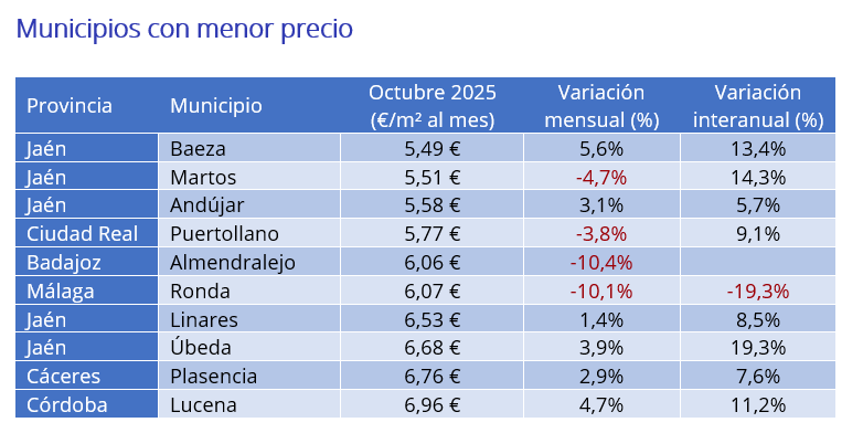 En cuanto al precio por metro cuadrado en octubre, vemos que diez municipios sobrepasan los 20,00 €/m2 al mes y son: Esplugues de Llobregat con 25,89 €/m2 al mes, Barcelona capital con 23,47 €/m2 al mes, Calvià con 22,87 €/m2 al mes, Madrid capital con 22,37 €/m2 al mes, Eivissa con 21,90 €/m2 al mes, L’Hospitalet de Llobregat con 21,31 €/m2 al mes, San Bartolomé de Tirajana con 21,21 €/m2 al mes, Badalona con 20,61 €/m2 al mes, Castelldefels con 20,11 €/m2 al mes y Donostia – San Sebastián con 20,03 €/m2 al mes. Por otro lado, las cuatro ciudades en donde el precio del alquiler por metro cuadrado más económico es: Baeza con 5,49 €/m2 al mes, Martos con 5,51 €/m2 al mes, Andújar con 5,58 €/m2 al mes y Puertollano con 5,77 €/m2 al mes.