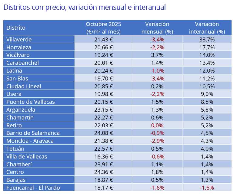 El precio del alquiler sube en octubre en 19 de los 20 distritos analizados con variación interanual y son: Villaverde (33,7%), Hortaleza (17,7%), Vicálvaro (14,0%), Carabanchel (13,4%), Latina (12,0%), San Blas (11,2%), Ciudad Lineal (10,5%), Usera (9,0%), Puente de Vallecas (8,5%), Arganzuela (5,8%), Chamartín (5,2%), Retiro (5,2%), Barrio de Salamanca (4,5%), Moncloa – Aravaca (4,3%), Tetuán (4,0%), Villa de Vallecas (1,4%), Chamberí (1,4%), Centro (1,4%) y Barajas (1,3%).