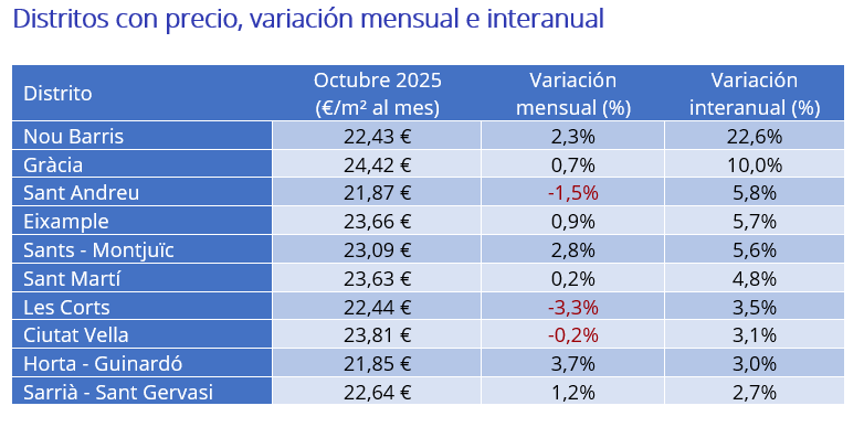 El precio del alquiler sube en octubre en los diez distritos con variación interanual. Los distritos con incrementos interanuales son: Nou Barris (22,6%), Gràcia (10,0%), Sant Andreu (5,8%), Eixample (5,7%), Sants – Montjuïc (5,6%), Sant Martí (4,8%), Les Corts (3,5%), Ciutat Vella (3,1%), Horta – Guinardó (3,0%) y Sarrià – Sant Gervasi (2,7%).