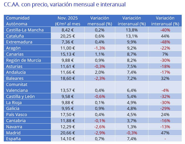 Si analizamos los precios del alquiler respecto a los de hace un año, se observa que en 16 de las 17 comunidades se incrementa el precio interanual en noviembre. Las comunidades autónomas con incrementos de mayor a menor son: Castilla-La Mancha (13,8%), Cataluña (13,1%), Extremadura (9,9%), Aragón (9,2%), Canarias (8,7%), Región de Murcia (8,2%), Asturias (7,5%), Andalucía (7,4%), Baleares (7,2%), Comunitat Valenciana (6,4%), Castilla y León (5,4%), La Rioja (4,9%), Galicia (4,8%), País Vasco (4,5%), Cantabria (3,7%) y Navarra (1,3%). Por otro lado, en Comunidad de Madrid (-0,3%) se produce el primer descenso interanual después de 45 meses de incrementos interanuales en cadena (desde febrero de 2022).