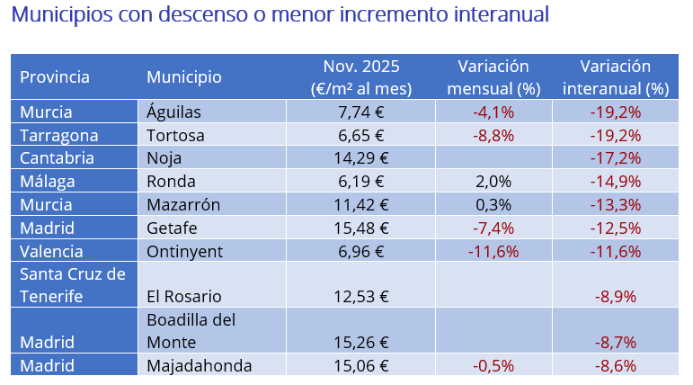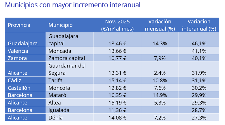 En el 83% de los 243 municipios analizados con variación interanual el precio de las viviendas en alquiler se ha incrementado respecto al año anterior. El orden de las diez ciudades de mayor o menor incremento interanual es: Guadalajara capital (46,1%), Moncada (41,1%), Zamora capital (40,1%), Guardamar del Segura (31,9%), Tarifa (31,1%), Moncofa (30,2%), Mataró (29,9%), Altea (29,3%), Igualada (28,7%) y Dénia (27,3%). Por otro lado, las tres ciudades con los mayores descensos en un año son: Águilas (-19,2%), Tortosa (-19,2%) y Noja (-17,2%).