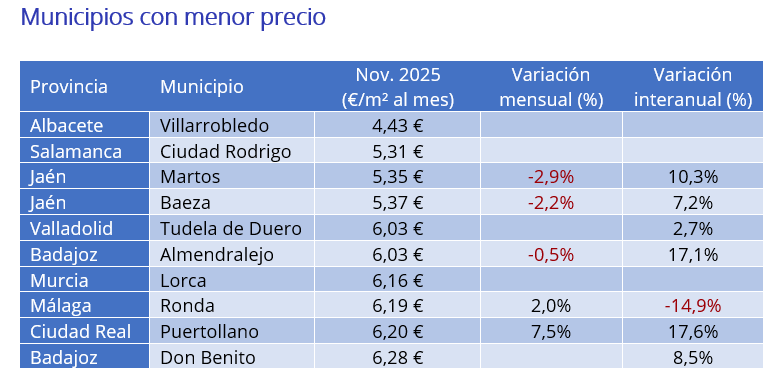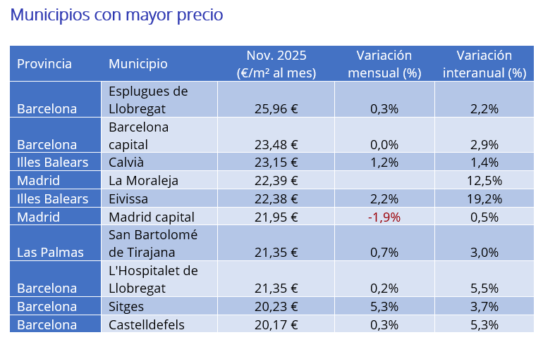 En cuanto al precio por metro cuadrado en noviembre, vemos que 12 municipios sobrepasan los 20,00 €/m2 al mes y son: Esplugues de Llobregat con 25,96 €/m2 al mes, Barcelona capital con 23,48 €/m2 al mes, Calvià con 23,15 €/m2 al mes, La Moraleja con 22,39 €/m2 al mes, Eivissa con 22,38 €/m2 al mes, Madrid capital con 21,95 €/m2 al mes, San Bartolomé de Tirajana con 21,35 €/m2 al mes, L’Hospitalet de Llobregat con 21,35 €/m2 al mes, Sitges con 20,23 €/m2 al mes, Castelldefels con 20,17 €/m2 al mes, Santa Eulària des Riu con 20,08 €/m2 al mes y Donostia – San Sebastián con 20,06 €/m2 al mes. Por otro lado, las cuatro ciudades en donde el precio del alquiler por metro cuadrado más económico es: Villarrobledo con 4,43 €/m2 al mes, Ciudad Rodrigo con 5,31 €/m2 al mes, Martos con 5,35 €/m2 al mes y Baeza con 5,37 €/m2 al mes.