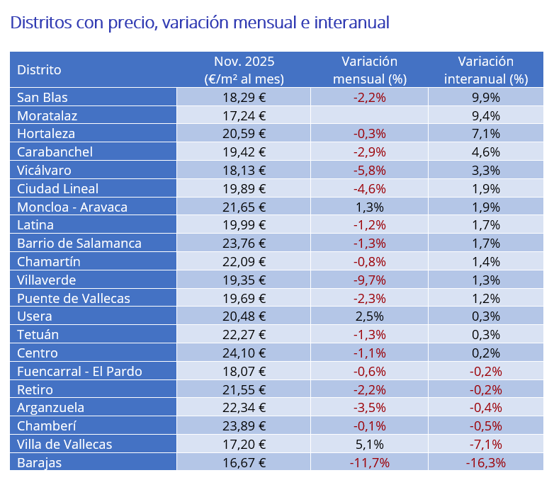El precio del alquiler sube en noviembre en 15 de los 21 distritos analizados con variación interanual y son: San Blas (9,9%), Moratalaz (9,4%), Hortaleza (7,1%), Carabanchel (4,6%), Vicálvaro (3,3%), Ciudad Lineal (1,9%), Moncloa – Aravaca (1,9%), Latina (1,7%), Barrio de Salamanca (1,7%), Chamartín (1,4%), Villaverde (1,3%), Puente de Vallecas (1,2%), Usera (0,3%), Tetuán (0,3%) y Centro (0,2%). Por otro lado, los distritos con descensos interanuales son: Barajas (-16,3%), Villa de Vallecas (-7,1%), Chamberí (-0,5%), Arganzuela (-0,4%), Retiro (-0,2%) y Fuencarral – El Pardo (-0,2%).