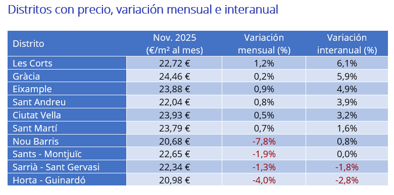 El precio del alquiler sube en noviembre en ocho de los diez distritos con variación interanual. Los distritos con incrementos interanuales son: Les Corts (6,1%), Gràcia (5,9%), Eixample (4,9%), Sant Andreu (3,9%), Ciutat Vella (3,2%), Sant Martí (1,6%), Nou Barris (0,8%) y Sants – Montjuïc (0,0%). Por otro lado, los distritos con descensos interanuales son Horta – Guinardó (-2,8%) y Sarrià – Sant Gervasi (-1,8%).