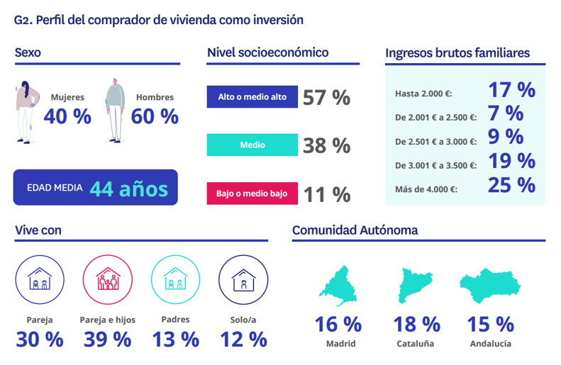 El nivel socioeconómico es otro de los elementos clave del perfil inversor. El 57% de los inversores pertenece a las clases alta y media-alta, un porcentaje superior al de los demandantes no inversores, que se sitúa en el 51%. En el caso de las clases medias, los inversores representan el 30%, mientras que entre los no inversores este grupo desciende hasta el 26%. Esta diferencia también se refleja en los ingresos. Uno de cada cuatro inversores (25%) declara unos ingresos brutos mensuales de la unidad familiar superiores a los 4.000 euros, frente al 17% de quienes compran vivienda habitual o segunda residencia. Este mayor nivel de renta explica, en parte, la capacidad de acceso a la inversión inmobiliaria.
