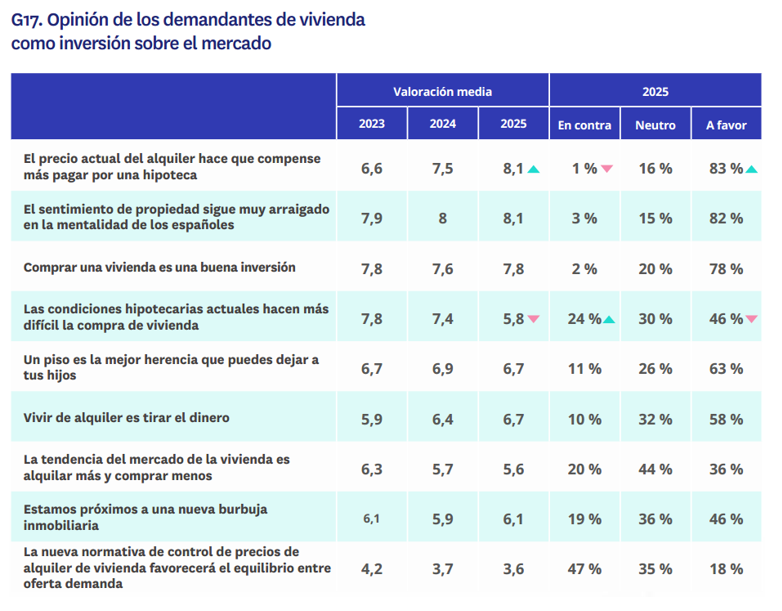 La percepción de los inversores sobre el mercado inmobiliario español sigue siendo claramente positiva en 2025. El sentimiento de propiedad continúa muy vigente: el 82% de los inversores lo respalda, apenas un punto menos que el año anterior, y le otorgan una nota media de 8,1 sobre 10. La idea que gana más fuerza este año es que, con el precio actual del alquiler, compensa más pagar una hipoteca. Esta afirmación es compartida por el 83% de los inversores en 2025, frente al 70% de 2024, y alcanza una valoración media de 8,1 puntos, superior a los 7,5 del ejercicio anterior. En línea con esta percepción, aumenta también el porcentaje de quienes consideran que alquilar una vivienda es tirar el dinero, que pasa del 56% al 58%.