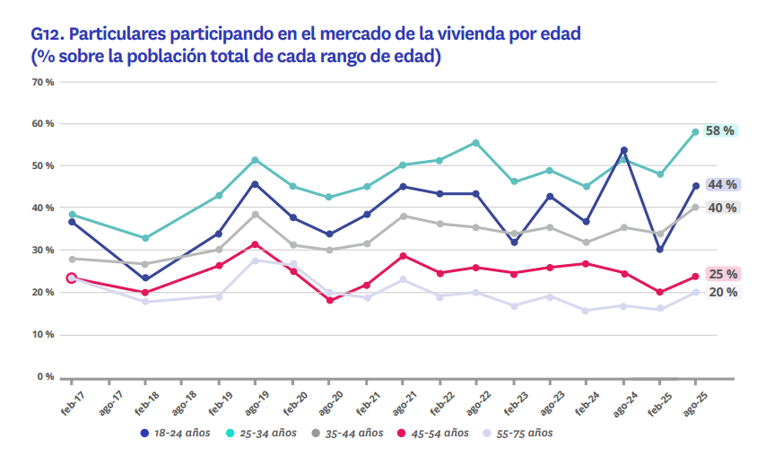 El mercado de la vivienda vuelve a mostrar en el segundo semestre de 2025 notables diferencias en función de la edad. Las dinámicas generacionales dibujan un escenario de contrastes: mientras los más jóvenes pierden peso en el conjunto del mercado, los grupos situados entre los 25 y los 44 años concentran una actividad creciente, con un protagonismo especialmente intenso en el ámbito de la compraventa.
