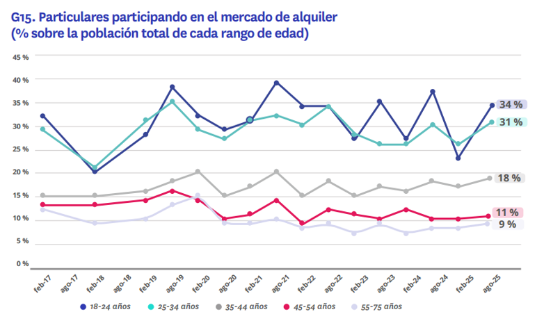 En 2024, el 54% de los particulares entre 18 y 24 años había realizado alguna acción en el mercado en los doce meses previos, mientras que un año después, ese porcentaje cae al 44%conviven en pareja, o bien en pareja con hijos. En lo relativo al alquiler, el perfil del demandante mantiene un mayor equilibrio de género (un 51% de hombres versus un 49% de mujeres), y la edad media se sitúa en 37 años, cuatro años menos en comparación con los vendedores. En este perfil, ganan peso quienes conviven con los padres (del 28% al 29%).