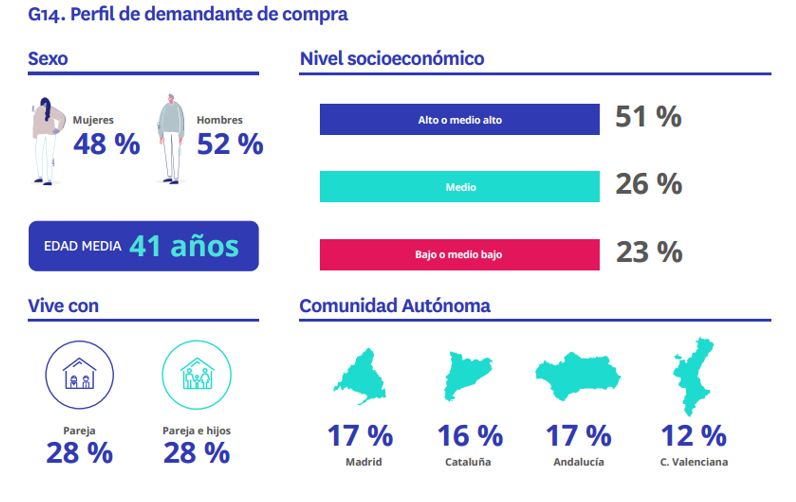 El documento también analiza los perfiles sociodemográficos asociados a cada mercado. En lo relativo a la propiedad, el descenso de jóvenes compradores hace que la edad media del demandante suba de 40 a 41 años.