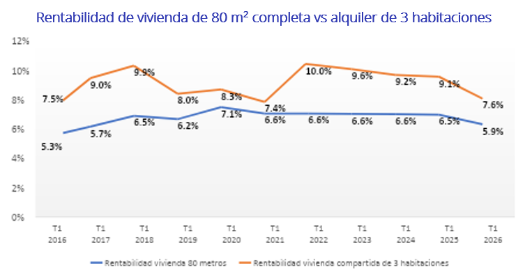 La rentabilidad en España de una vivienda de 80 metros cuadrados en marzo se sitúa en un 5,9% y la de una vivienda compartida de tres habitaciones en un 7,6% es decir, una diferencia de 1,7 puntos porcentuales, según el estudio de “La rentabilidad de la vivienda en España en 2026”, basado en el análisis de los precios de la vivienda en venta y alquiler de marzo de 2026 por el portal inmobiliario Fotocasa.