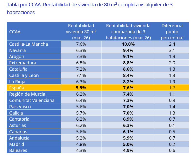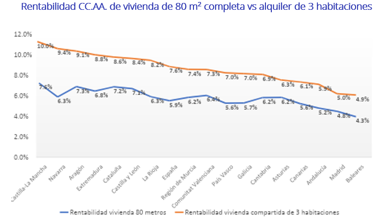 De esta manera, el orden de las CCAA con las máximas rentabilidades de las viviendas de alquiler por habitaciones es: Castilla-La Mancha con 10,0% (7,6% rentabilidad piso 80 m2), Navarra con 9,4% (6,3% rentabilidad piso 80 m2), Aragón con 9,1% (7,3% rentabilidad piso 80 m2), Extremadura con 8,8% (6,8% rentabilidad piso 80 m2), Cataluña con 8,6% (7,2% rentabilidad piso 80 m2), Castilla y León con 8,4% (7,1% rentabilidad piso 80 m2), La Rioja con 8,2% (6,3% rentabilidad piso 80 m2), España con 7,6% (5,9% rentabilidad piso 80 m2), Región de Murcia con 7,4% (6,2% rentabilidad piso 80 m2), Comunitat Valenciana con 7,3% (6,4% rentabilidad piso 80 m2), País Vasco con 7,0% (5,6% rentabilidad piso 80 m2), Galicia con 7,0% (5,7% rentabilidad piso 80 m2), Cantabria con 6,9% (6,2% rentabilidad piso 80 m2), Asturias con 6,3% (6,2% rentabilidad piso 80 m2), Canarias con 6,1% (5,6% rentabilidad piso 80 m2), Andalucía con 5,9% (5,2% rentabilidad piso 80 m2), Madrid con 5,0% (4,8% rentabilidad piso 80 m2) y Baleares con 4,9% (4,3% rentabilidad piso 80 m2).