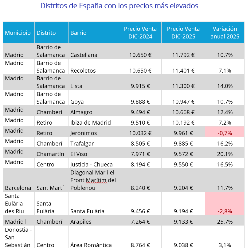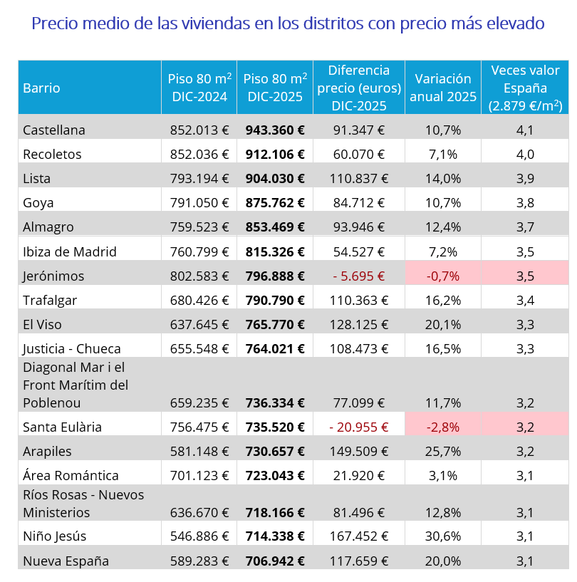 El ranking de los barrios más caros del país es: Castellana con 11.792 €/m2, Recoletos con 11.401 €/m2, Lista con 11.300 €/m2, Goya con 10.947 €/m2, Almagro con 10.668 €/m2, Ibiza de Madrid con 10.192 €/m2, Jerónimos con 9.961 €/m2, Trafalgar con 9.885 €/m2, El Viso con 9.572 €/m2, Justicia – Chueca con 9.550 €/m2, Diagonal Mar i el Front Marítim del Poblenou con 9.204 €/m2, Santa Eulària con 9.194 €/m2, Arapiles con 9.133 €/m2, Área Romántica con 9.038 €/m2, Ríos Rosas – Nuevos Ministerios con 8.977 €/m2, Niño Jesús con 8.929 €/m2, Nueva España con 8.837 €/m2, Pedralbes con 8.829 €/m2, Marina Botafoc – Platja de Talamanca con 8.485 €/m2 y Cortes – Huertas con 8.386 €/m2.