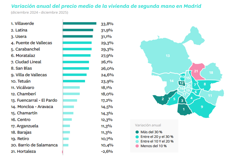 Por debajo de los 5.000 euros por metro cuadrado se encuentran Barajas, con 4.801 euros y una subida del 11%; Moratalaz, con 4.273 euros y un incremento del 28%; San Blas, con 4.052 euros y una variación del 26%; Vicálvaro, con 4.009 euros por metro cuadrado y una subida del 18%; Latina, con 3.822 euros y un aumento del 32%; Carabanchel, con 3.639 euros y una variación del 29%; Villa de Vallecas, con 3.555 euros y una subida del 25%; Usera, con 3.474 euros por metro cuadrado y un incremento del 31%; Puente de Vallecas, con 3.129 euros y una variación del 29%; y Villaverde, que se mantiene como el distrito más asequible de la capital, con 2.648 euros por metro cuadrado tras encarecerse un 34% en el último año.