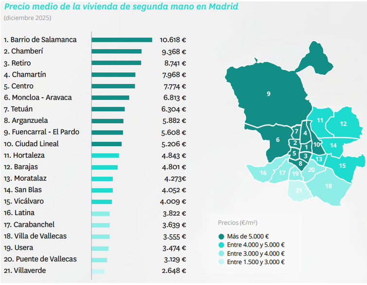 El análisis por distritos en Madrid muestra una gran disparidad de precios. Ordenados de mayor a menor precio, el distrito más caro es Salamanca, con 10.618 euros por metro cuadrado y una variación interanual del 10%. Le sigue Chamberí, con un precio medio de 9.368 euros por metro cuadrado, tras aumentar un 18% en el último año. A continuación, se sitúan Retiro, con 8.741 euros por metro cuadrado y una subida interanual del 11%, y Chamartín, que alcanza los 7.968 euros por metro cuadrado tras encarecerse un 14%.