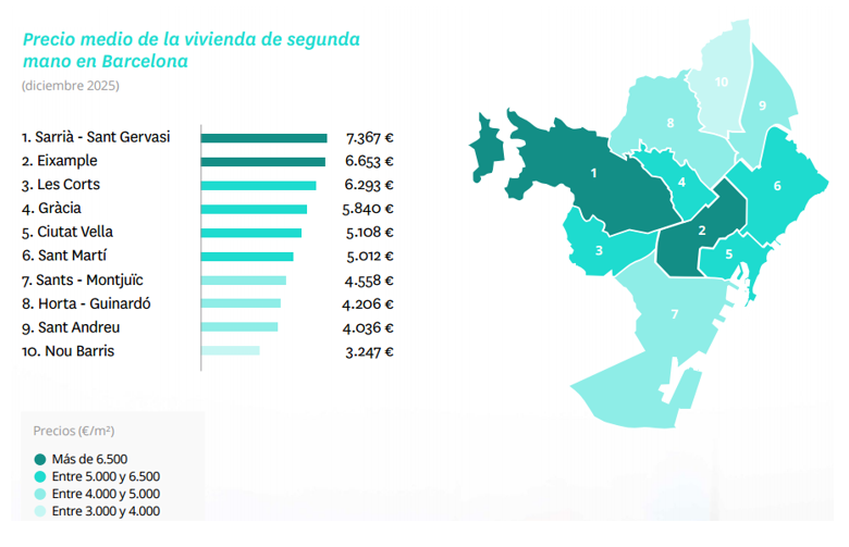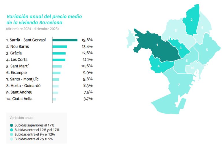 En Barcelona, los precios han subido en todos los barrios. El distrito con el precio más elevado al cierre de 2025 es Sarrià – Sant Gervasi, que alcanza los 7.367 euros por metro cuadrado tras registrar una variación interanual del 20%. Le sigue el Eixample, con un precio medio de 6.653 euros por metro cuadrado y una subida del 10%, y Les Corts, que se sitúa en 6.293 euros por metro cuadrado tras aumentar un 12%. Gràcia registra un precio de 5.840 euros por metro cuadrado, con una variación interanual del 13%. A continuación, se encuentra Ciutat Vella, con 5.108 euros por metro cuadrado y una subida más moderada del 4%, seguida de Sant Martí, que alcanza los 5.012 euros por metro cuadrado tras incrementarse un 11%.