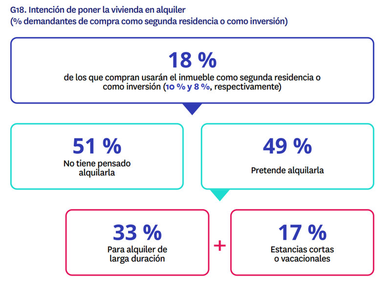 El informe también analiza al detalle este segmento de los compradores que adquieren una vivienda como inversión o segunda residencia. Entre este grupo, se observa una caída importante en la intención de destinar los inmuebles al alquiler. En conjunto, menos de la mitad de los compradores que adquieren como inversión o segunda residencia (49%) optan por el alquiler como vía de rentabilidad, frente al 57% del año pasado. El alquiler vacacional o de corta duración se mantiene en el 17%, sin variaciones respecto al ejercicio anterior, lo que indica que la caída se concentra en el arrendamiento tradicional de larga estancia. Concretamente, en 2025, el 33% de los encuestados manifiesta este objetivo, frente al 41% de 2024, lo que supone una disminución de ocho puntos porcentuales.