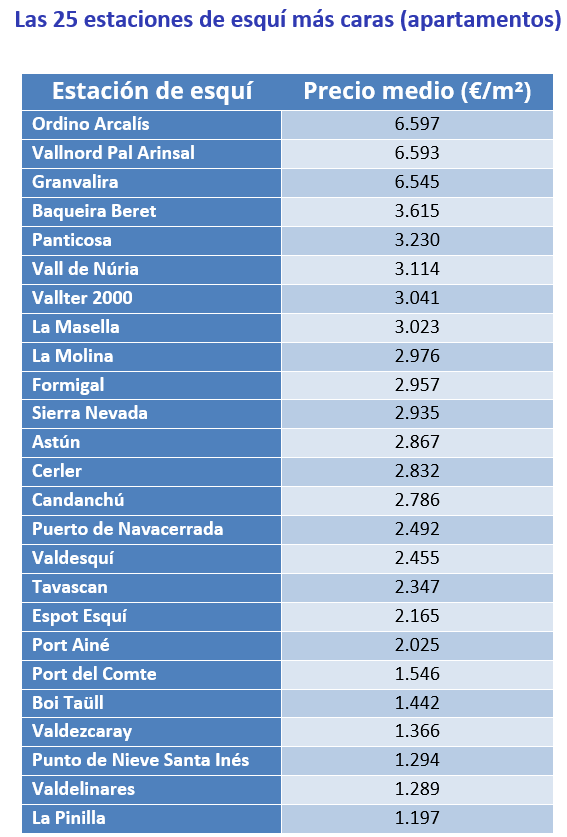 Al margen de las pistas de esquí andorranas y de Baqueira Beret (situada en el Valle de Arán, en Cataluña), las estaciones del Pirineo aragonés y catalán dominan el mapa de los precios más elevados. Tras las citadas localizaciones, destacan Panticosa, con un precio medio de los apartamentos de 3.230 euros por metro cuadrado, seguida de Vall de Núria (3.114 €/m²), Vallter 2000 (3.041 €/m²), La Masella (3.023 €/m²), La Molina (2.976 €/m²), y Formigal (2.957 €/m²). Si se pone el foco en los chalés, el listado es muy parecido, con registros similares en las pistas catalanas de La Masella (de 3.081€/m²), La Molina (3.000 €/m²) o Vall de Núria (2.621 €/m²), así como en las estaciones aragonesas de Formigal (2.494 €/m²) y Astún (2.429 €/m²).