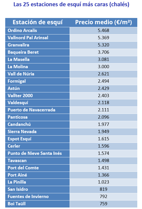 Si se pone el foco en los chalés, las cuatro estaciones de esquí mencionadas también lideran el listado de precios más elevados. De esta forma, Ordino Arcalís registra un precio de 5.468 euros por metro cuadrado, en lo referente a las casas unifamiliares, mientras que Vallnord Pal Arinsal (5.369 €/m²), Granvalira (5.320 €/m²), y Baqueira Beret (3.706 €/m²) le siguen en la clasificación.