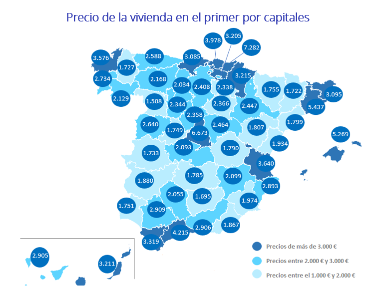 En cuanto al ranking de precios por capitales, 14 capitales superan la barrera de los 3.000 euros y son: Donostia – San Sebastián con 7.282 euros/m2, Madrid capital con 6.673 euros/m2, Barcelona capital con 5.437 euros/m2, Palma de Mallorca con 5.269 euros/m2, Málaga capital con 4.215 euros/m2, Bilbao con 3.978 euros/m2, Valencia capital con 3.640 euros/m2, A Coruña capital con 3.576 euros/m2, Cádiz capital con 3.319 euros/m2, Pamplona / Iruña con 3.215 euros/m2, Las Palmas de Gran Canaria con 3.211 euros/m2, Vitoria – Gasteiz con 3.205 euros/m2, Girona capital con 3.095 euros/m2 y Santander con 3.085 euros/m2.